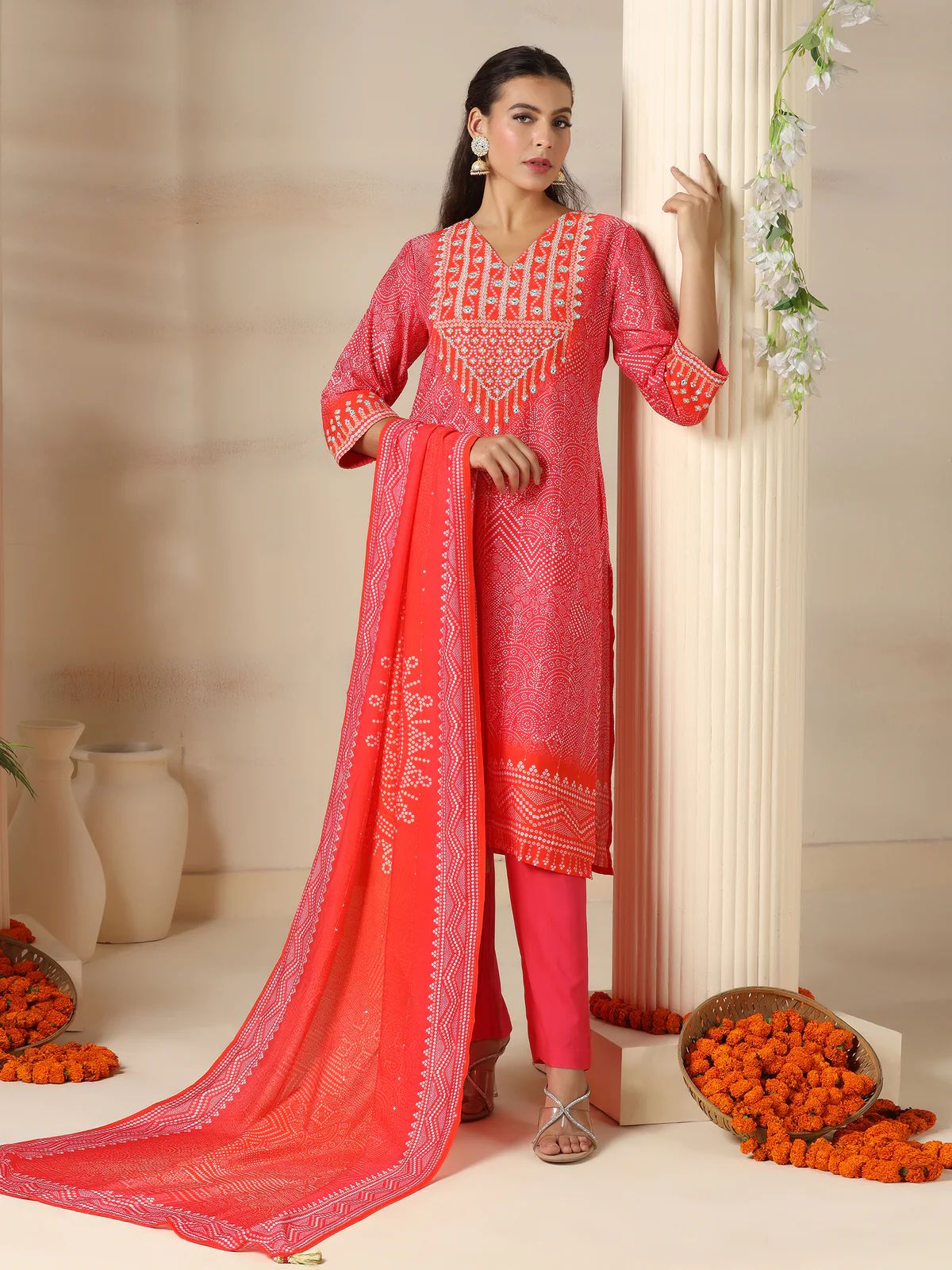 This women's ensemble features a pink Chanderi kurta embellished with traditional Bandhani print and delicate embroidery, paired with comfortable pants and a matching dupatta. Crafted from lightweight Chanderi fabric, it offers a subtle sheen and excellent breathability. The intricate Bandhani pattern and embroidery enhance its artisanal elegance, making this set ideal for festive and special occasions while ensuring comfort and style throughout the day.